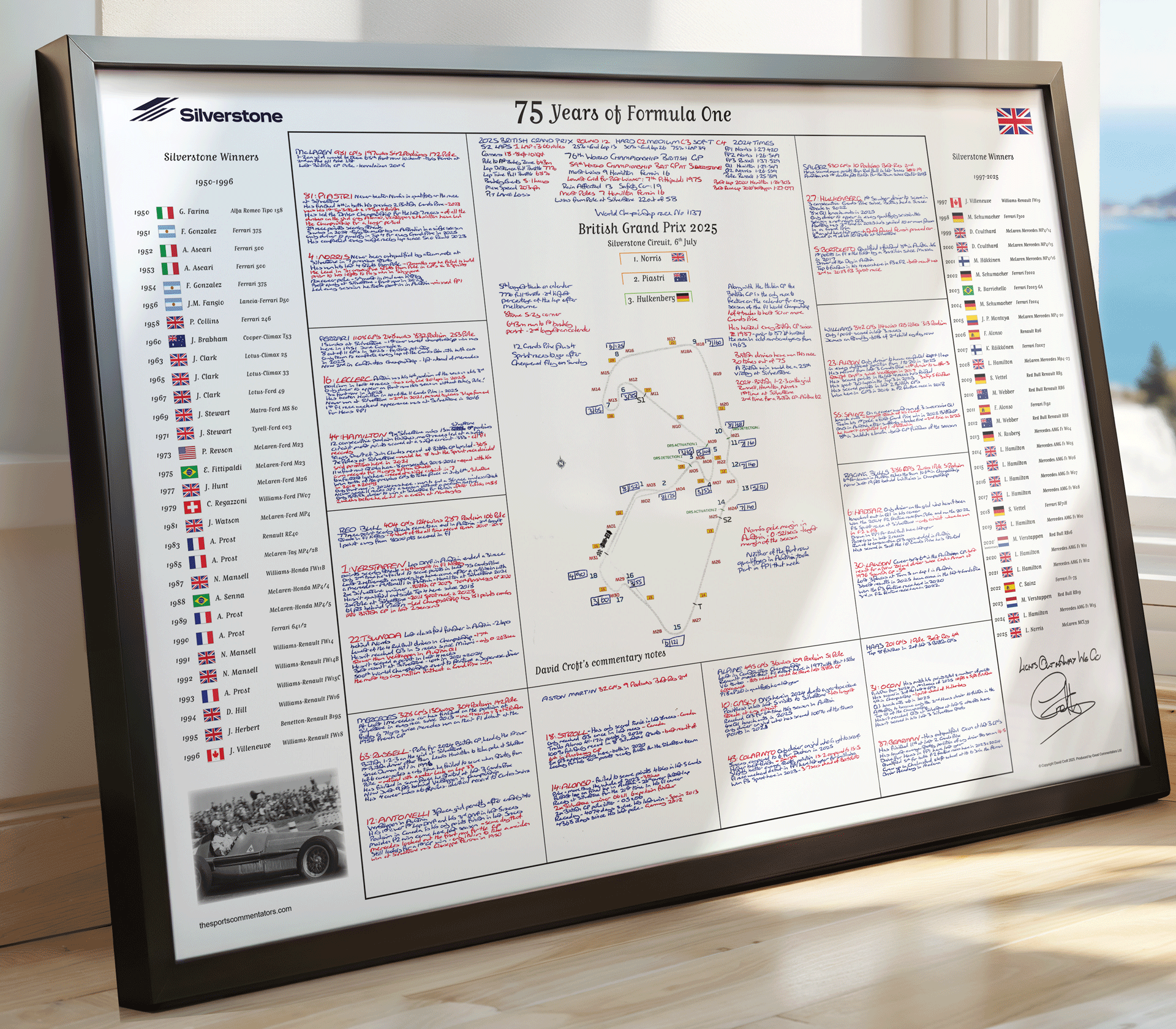 View full detailsA print of David Croft’s original commentary notes from the 2024 British Grand Prix, won by Mercedes' Lewis Hamilton. It was a record ninth Britis...