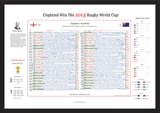 View full detailsA high quality print of ITV commentator, John Taylor's original commentary sheets for England’s famous Rugby World Cup triumph over Australia in Au...