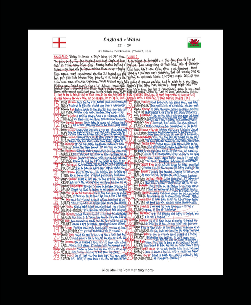The Sports CommentatorsA framed print of Nick Mullins' original commentary notes from the Six Nations match between England and Wales at Twickenham on March 7, 2020. Ava...