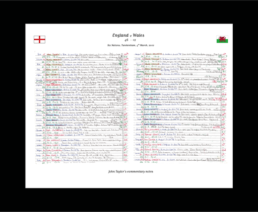 The Sports CommentatorsA framed print of John Taylor's commentary notes from the Six Nations match between England and Wales at Twickenham on March 3, 2000. Available as...