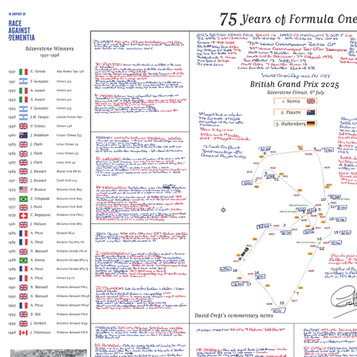 A print of David Croft’s original commentary notes from the 2024 British Grand Prix, won by Mercedes' Lewis Hamilton. It was a record ninth Britis...