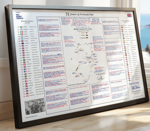 A print of Harry Benjamin’s original commentary notes from the 2024 British Grand Prix, won by Mercedes' Lewis Hamilton. It was a record ninth Bri...
