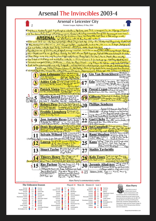 A print of Alan Parry's original commentary notes from Arsenal v Leicester City - the game that saw Arsenal go unbeaten and take the Premier League...