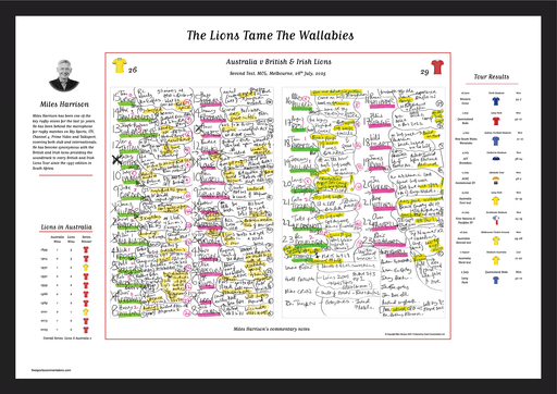 A framed print of Miles Harrison's commentary notes from the decisive Second test between the British and Irish Lions and Australia at the MCG, Mel...