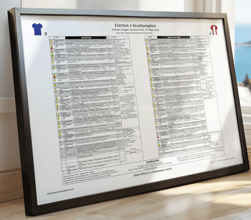 Discover our exclusive print collection of original Everton commentary notes from football's most iconic voices. Spanning decades of broadcasting excellence, these notes offer unprecedented insight into how history's greatest games were narrated in real-time. They included games at both Goodison Park and the new Hill Dickinson Stadium.