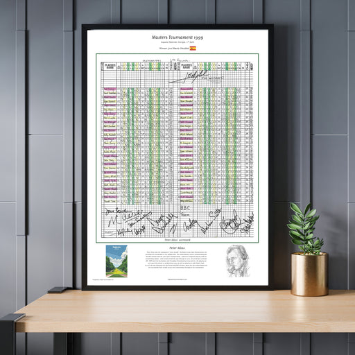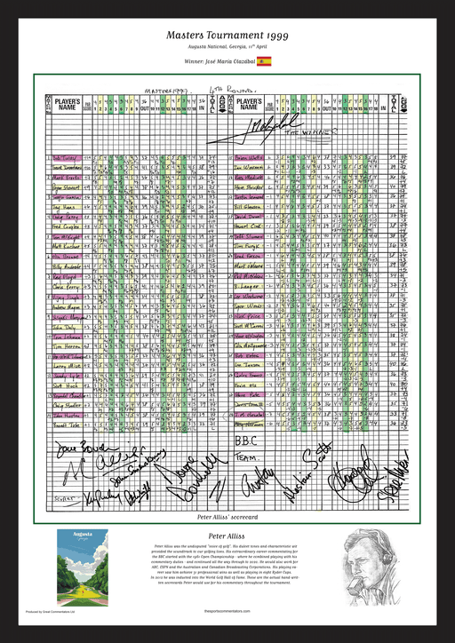 A print of the original hand-written scorecard used by Peter Alliss during his commentary of the 1999 Masters Tournament at Augusta National, Georg...