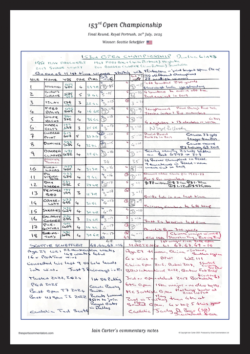 A high-quality print of Iain Carter's original commentary notes from the final round of the 2025 Open Championship at Royal Portrush on July 20, 20...