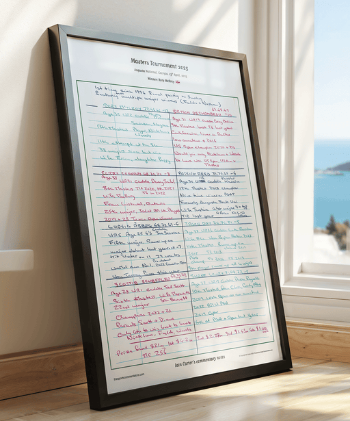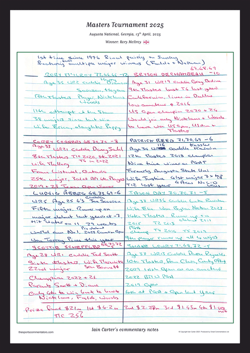A high-quality print of Iain Carter's original commentary notes from the final round of the 2025 Masters Tournament at Augusta National which was w...