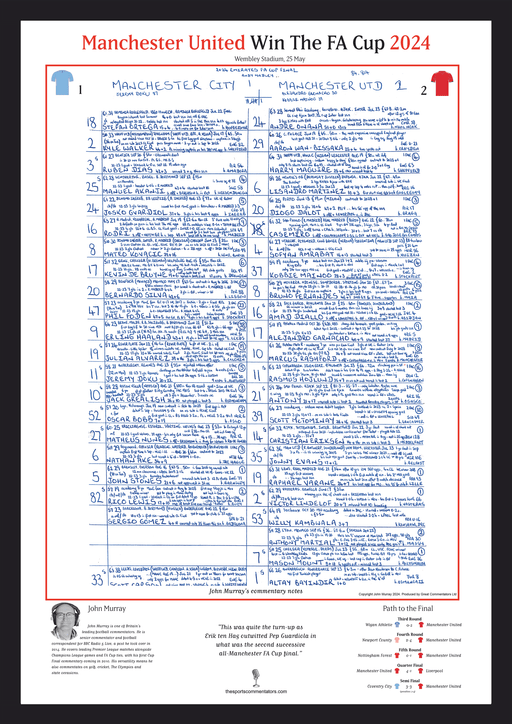 The Sports CommentatorsA printed tea towel of John Murray's commentary notes from Manchester United's FA Cup Final win over Manchester City at Wembley, 2024. The tea tow...