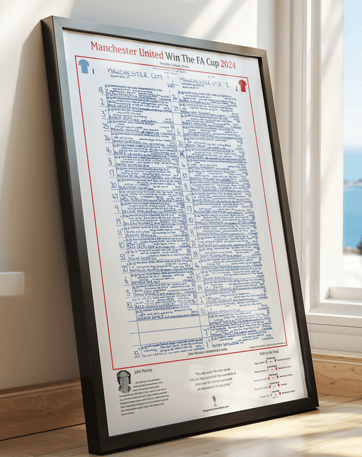 A framed print of John Murrays' original commentary notes from this FA Cup Final match between Manchester City and Manchester United, Wembley Stadi...