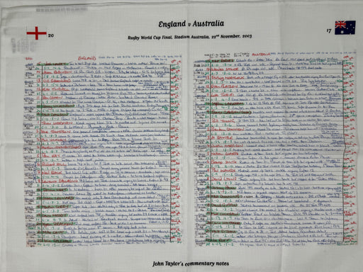 The Sports CommentatorsA printed tea towel of John Taylor's commentary notes from England's Rugby World Cup win over Australia in Sydney in 2003. The tea towel is 66cm x ...