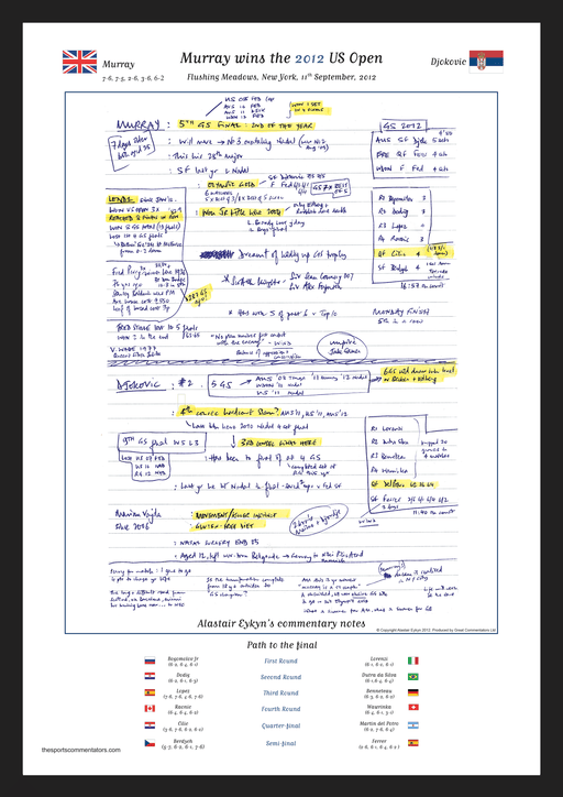 A print of of Alastair Eykyn's commentary notes from the US Open Men's Final played at Flushing Meadows, New York on September 11, 2012. Why we lov...