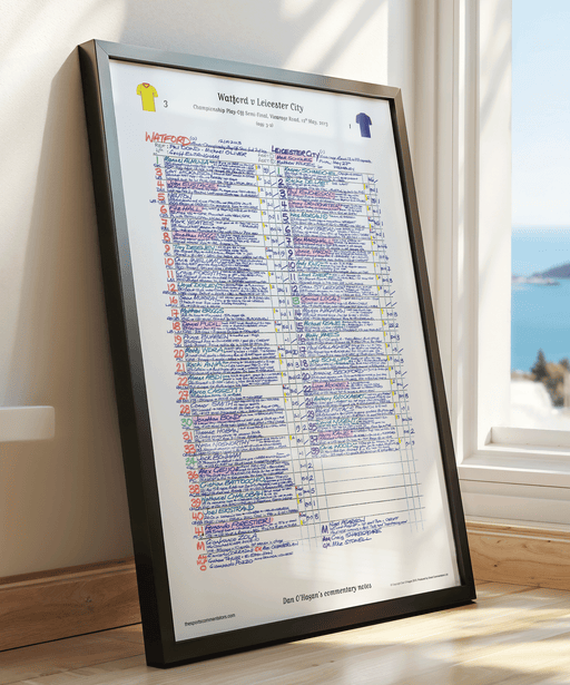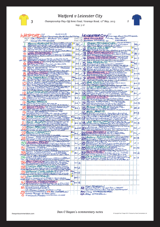 A print of Dan O'Hagan's original commentary notes from the Championship play-off semi-final match between Watford and Leicester City at the Vicar...